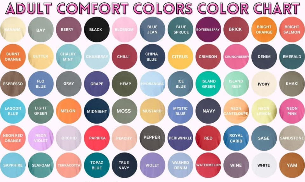 Choose tee color from list or color chart, along with what you want it to say if not Mother Hood and leave in notes at checkout! Listed: Neon Pink- Yellow ink, Neon Lemon- Neon Pink ink, Melon- Neon blue ink- Lagoon Blue- neon purple ink Violet- aqua ink Royal Carribean- green ink